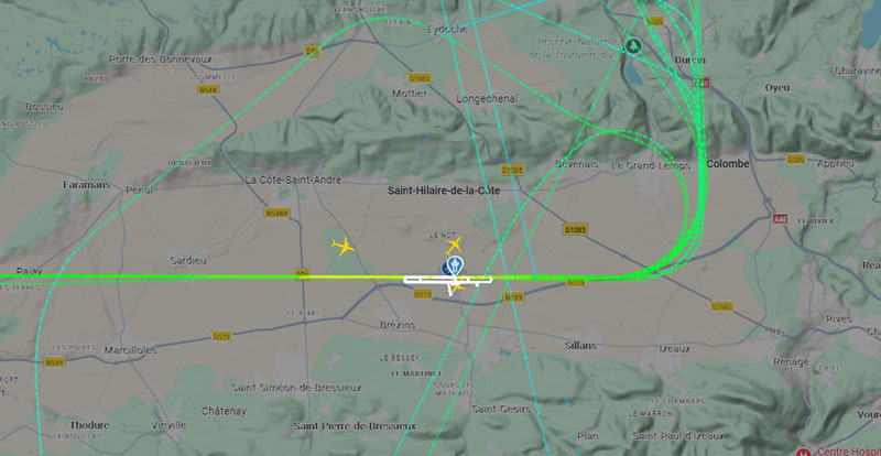 Visuel non représentatif de la réalité, perte fréquente de signaux et vols non visibles sur Flightradar. * PEB : Plan d’exposition au bruit, absolument non représentatif de la réalité.