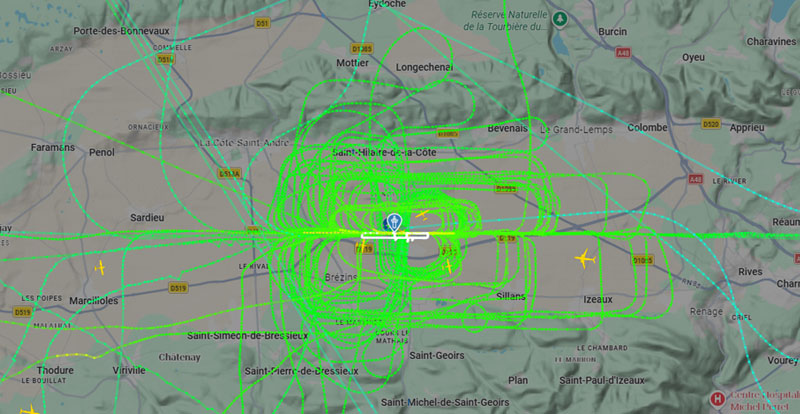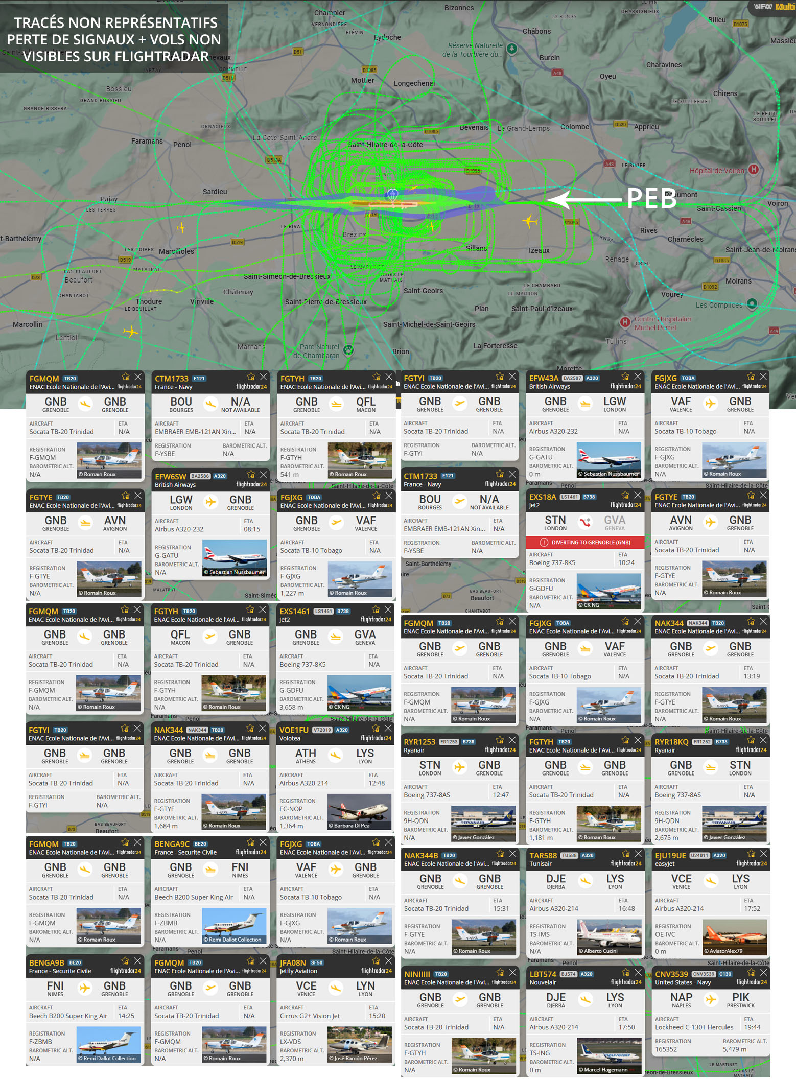 Visuel non représentatif de la réalité, perte fréquente de signaux et vols non visibles sur Flightradar. * PEB : Plan d’exposition au bruit, absolument non représentatif de la réalité.