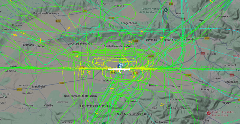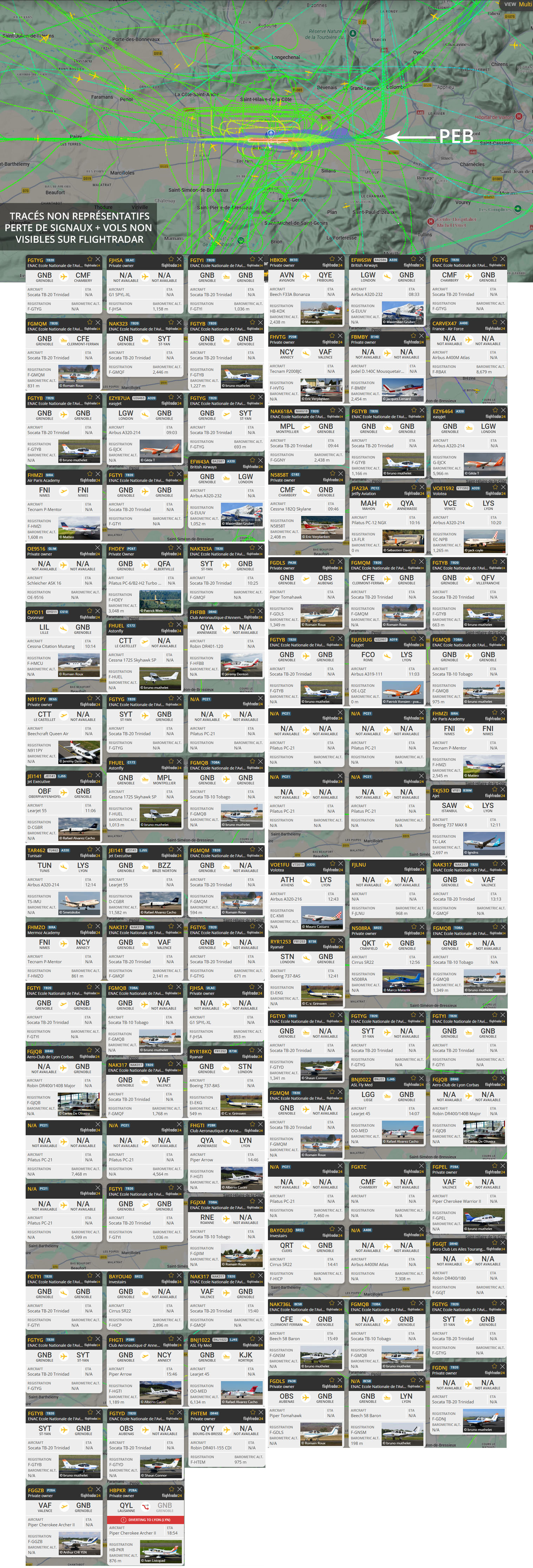 Visuel non représentatif de la réalité, perte fréquente de signaux et vols non visibles sur Flightradar. * PEB : Plan d’exposition au bruit, absolument non représentatif de la réalité.