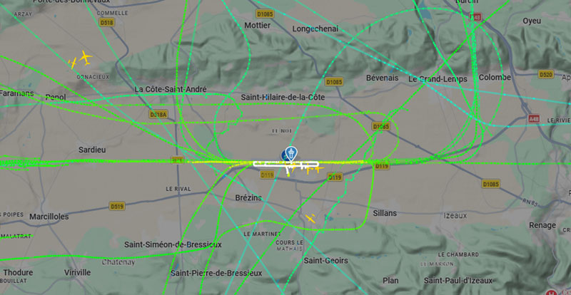 Visuel non représentatif de la réalité, perte fréquente de signaux et vols non visibles sur Flightradar. * PEB : Plan d’exposition au bruit, absolument non représentatif de la réalité.