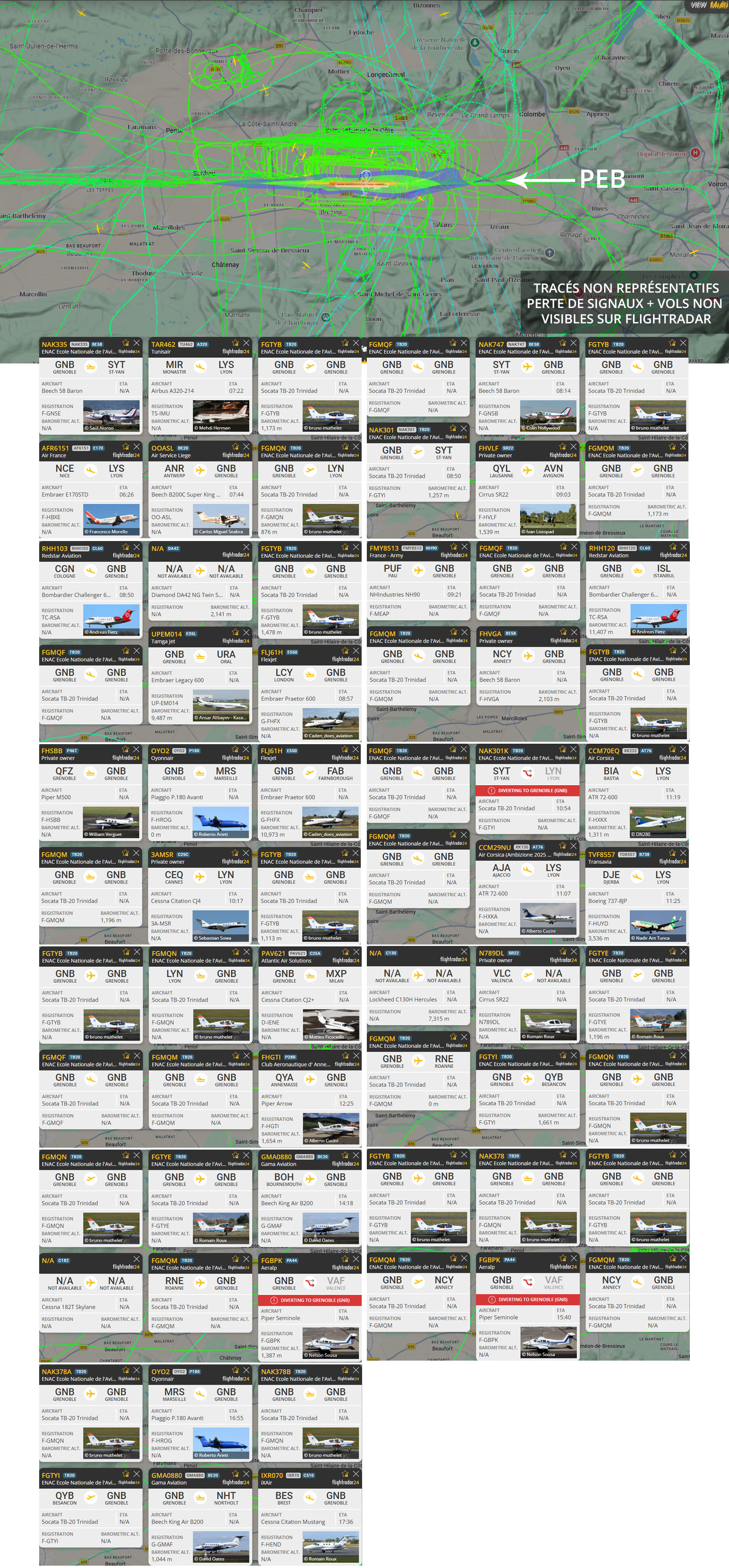 Visuel non représentatif de la réalité, perte fréquente de signaux et vols non visibles sur Flightradar. * PEB : Plan d’exposition au bruit, absolument non représentatif de la réalité.