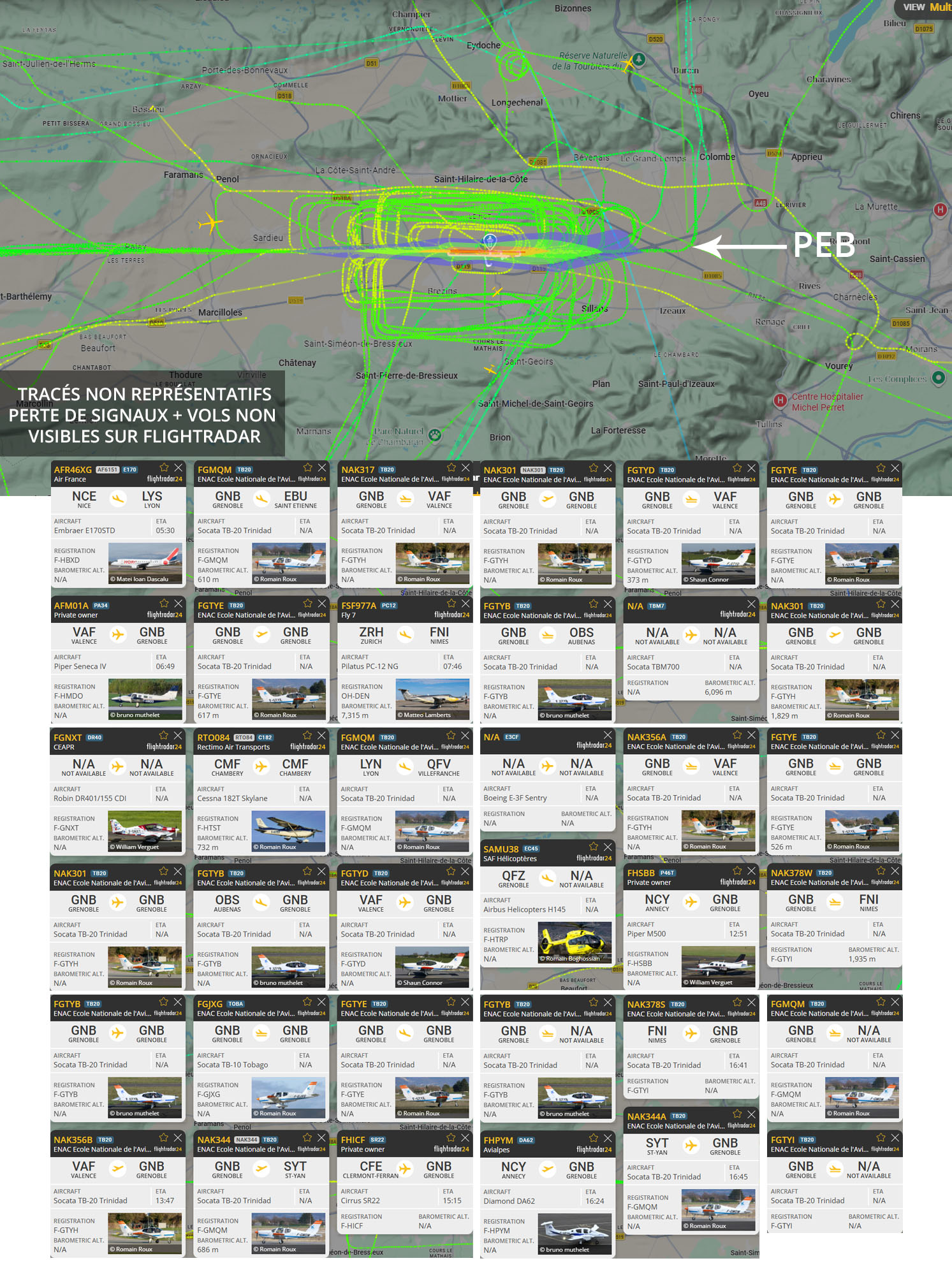 Visuel non représentatif de la réalité, perte fréquente de signaux et vols non visibles sur Flightradar. * PEB : Plan d’exposition au bruit, absolument non représentatif de la réalité.