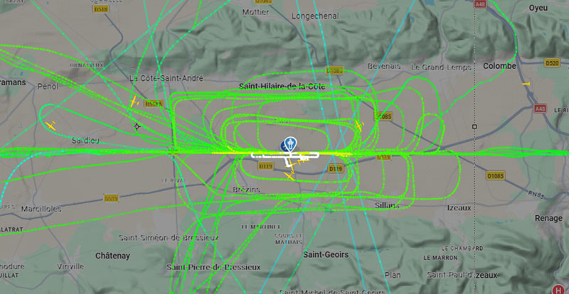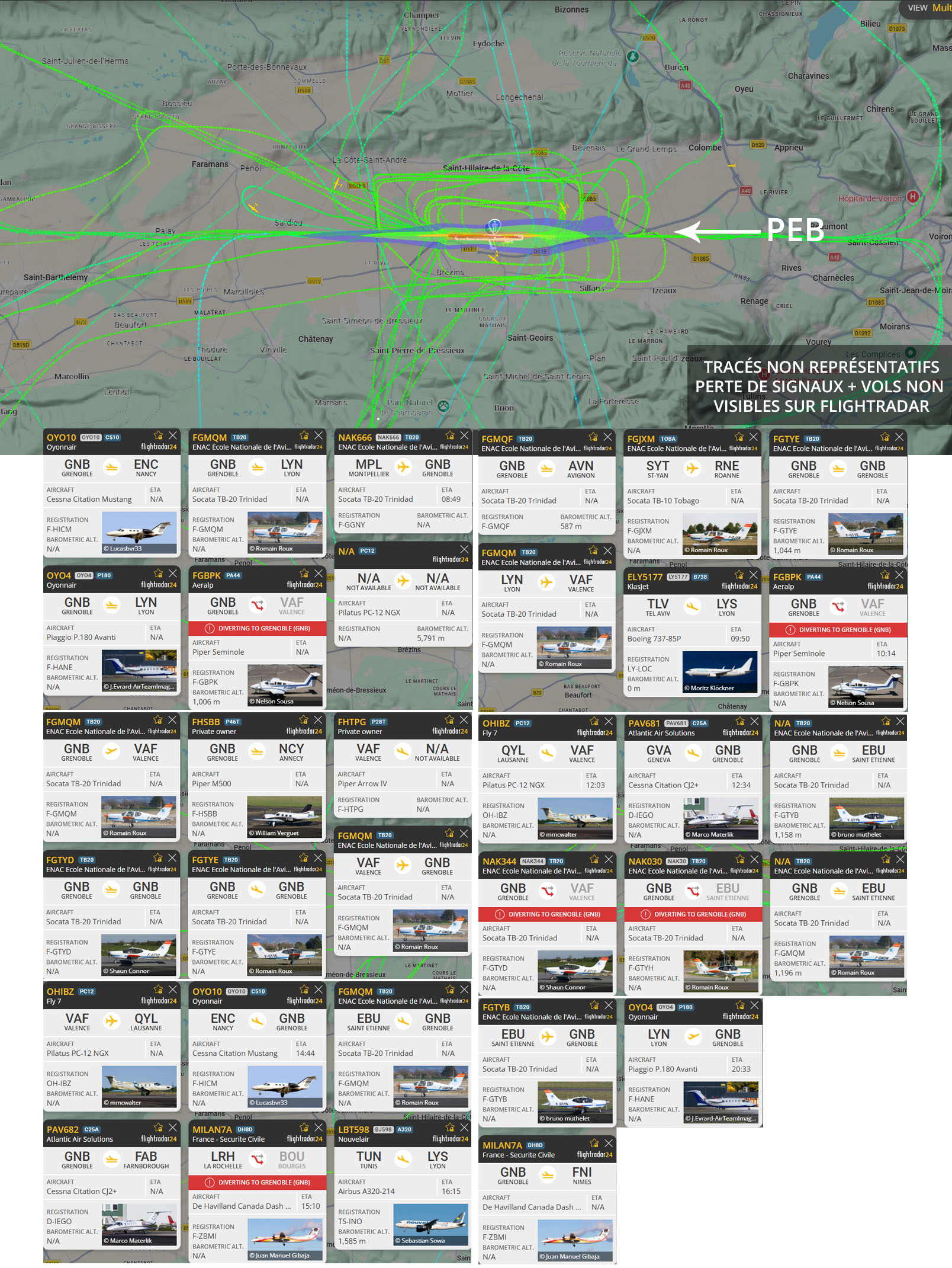Visuel non représentatif de la réalité, perte fréquente de signaux et vols non visibles sur Flightradar. * PEB : Plan d’exposition au bruit, absolument non représentatif de la réalité.