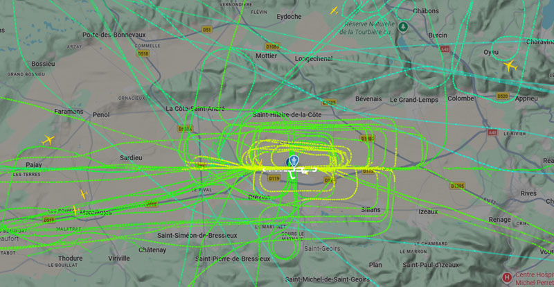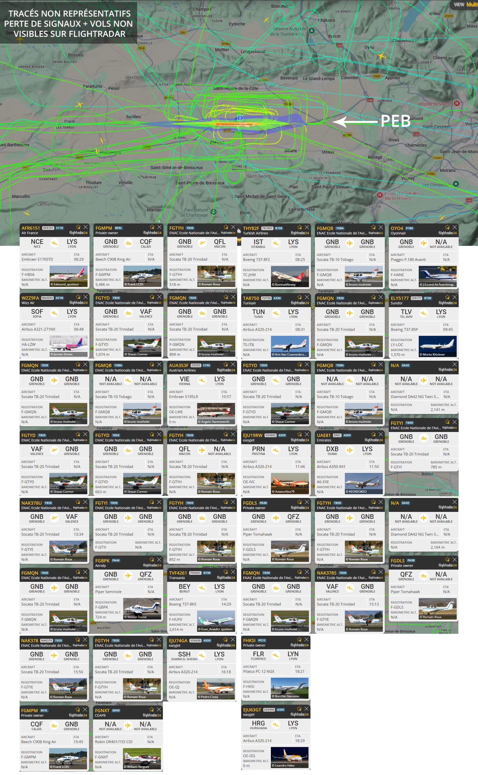 Visuel non représentatif de la réalité, perte fréquente de signaux et vols non visibles sur Flightradar. * PEB : Plan d’exposition au bruit, absolument non représentatif de la réalité.