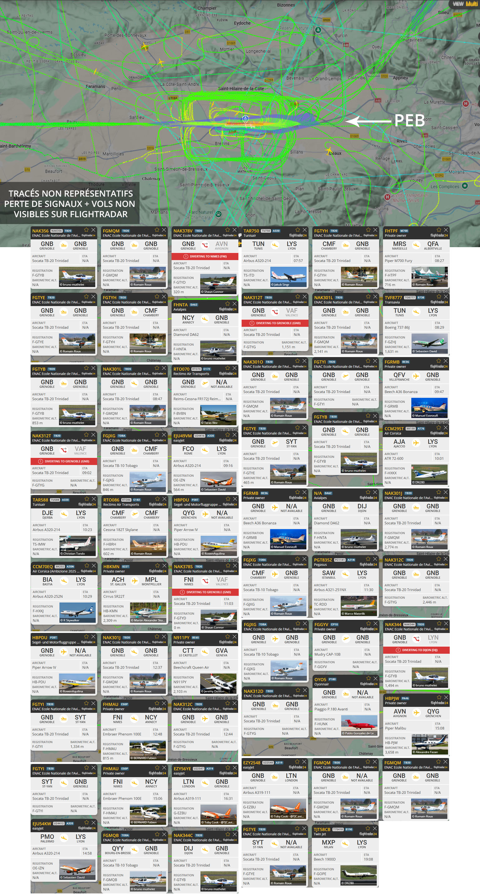 Visuel non représentatif de la réalité, perte fréquente de signaux et vols non visibles sur Flightradar. * PEB : Plan d’exposition au bruit, absolument non représentatif de la réalité.