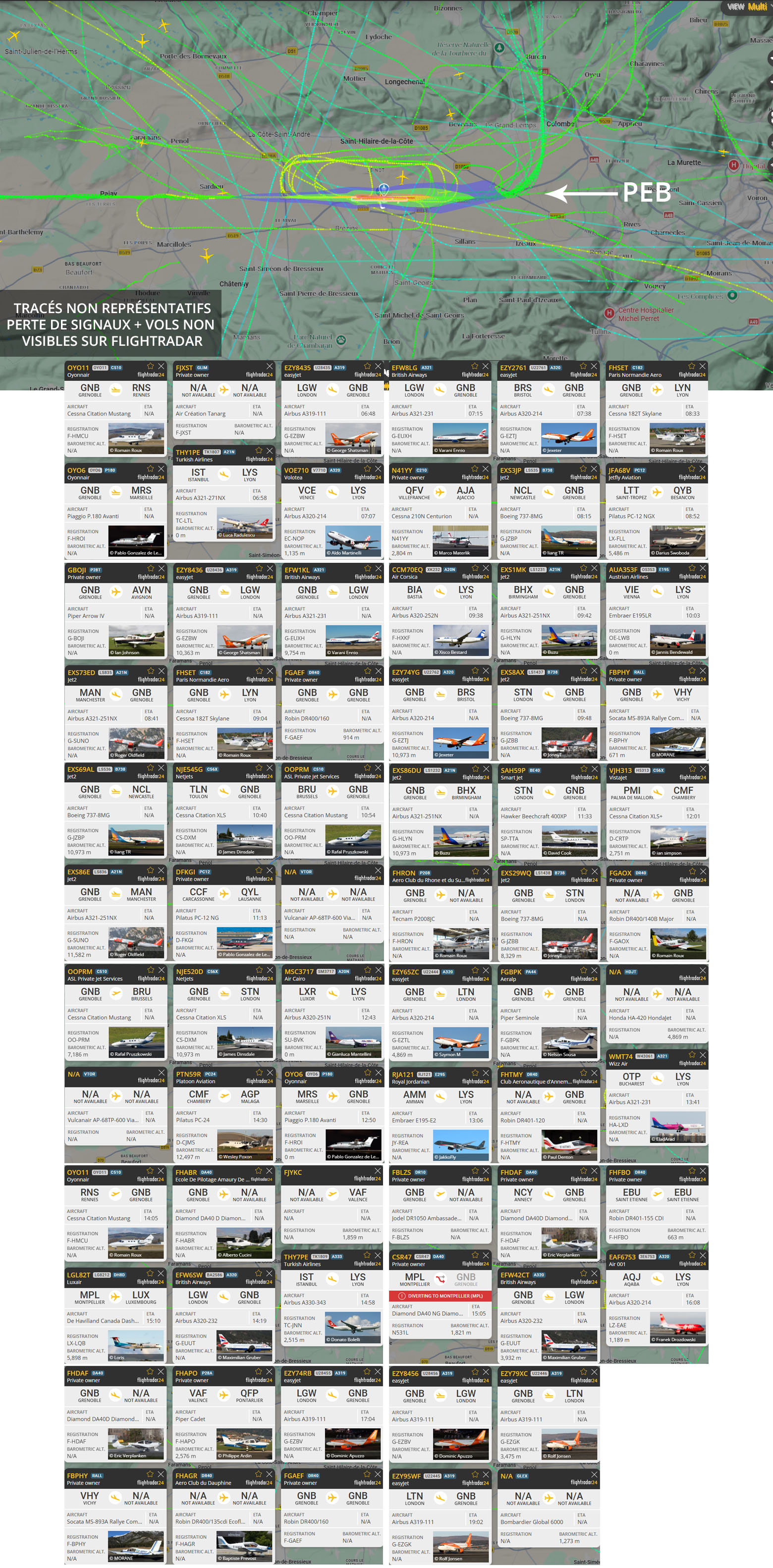 Visuel non représentatif de la réalité, perte fréquente de signaux et vols non visibles sur Flightradar. * PEB : Plan d’exposition au bruit, absolument non représentatif de la réalité.