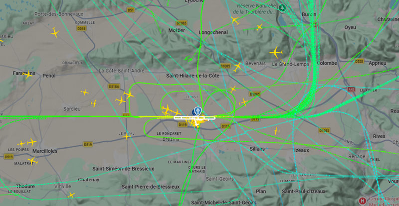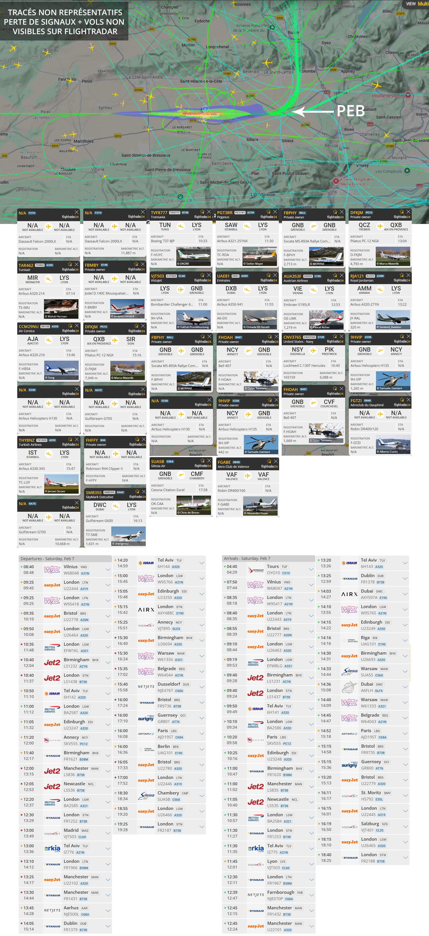 Visuel non représentatif de la réalité, perte fréquente de signaux et vols non visibles sur Flightradar. * PEB : Plan d’exposition au bruit, absolument non représentatif de la réalité.