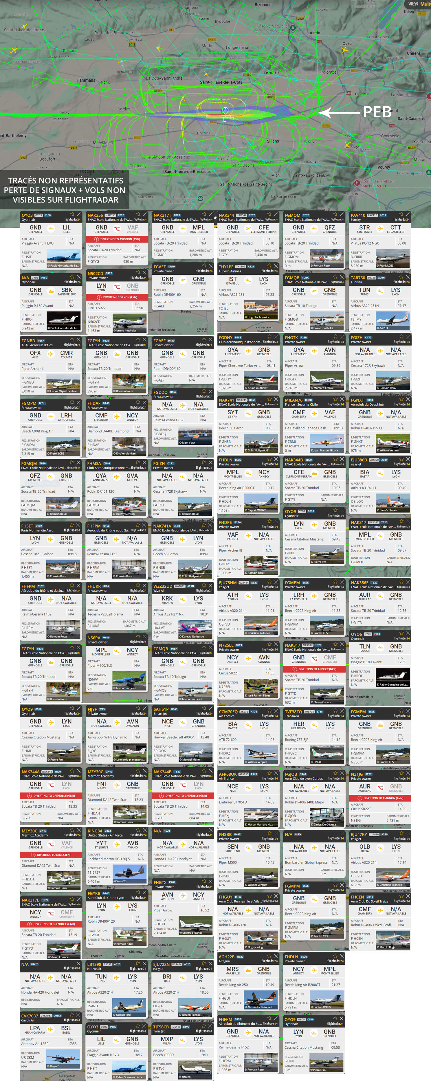 Visuel non représentatif de la réalité, perte fréquente de signaux et vols non visibles sur Flightradar. * PEB : Plan d’exposition au bruit, absolument non représentatif de la réalité.