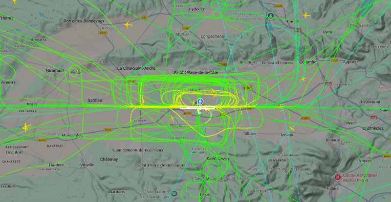 Visuel non représentatif de la réalité, perte fréquente de signaux et vols non visibles sur Flightradar. * PEB : Plan d’exposition au bruit, absolument non représentatif de la réalité.