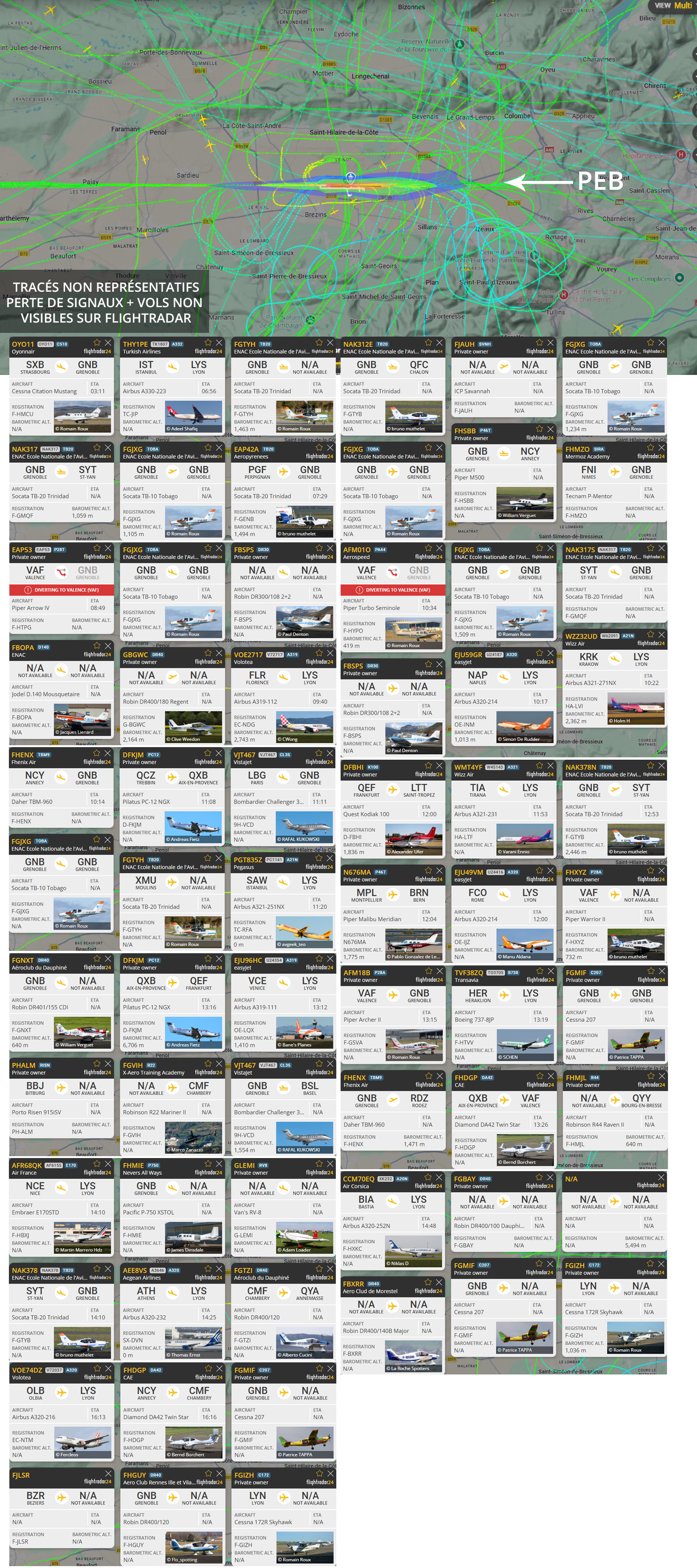 Visuel non représentatif de la réalité, perte fréquente de signaux et vols non visibles sur Flightradar. * PEB : Plan d’exposition au bruit, absolument non représentatif de la réalité.