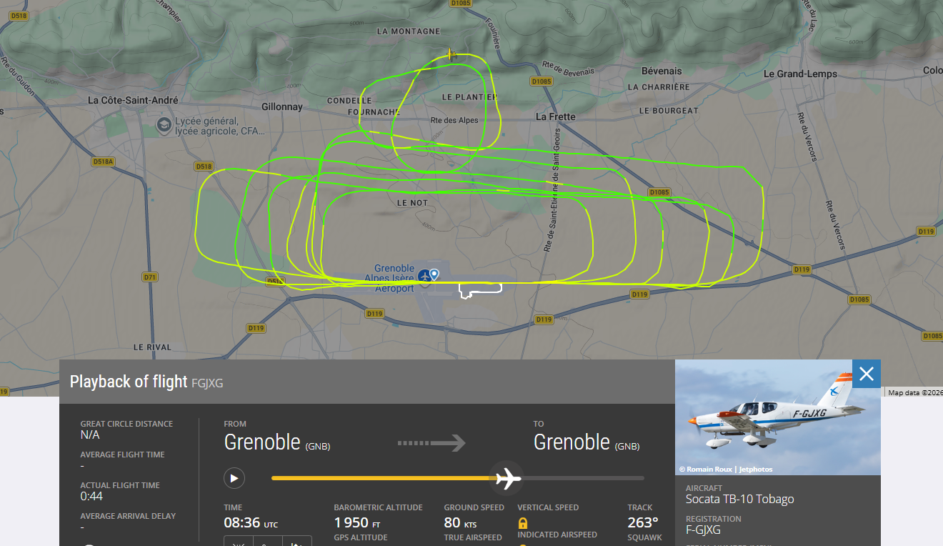 De très grosses nuisances majoritairement le matin. Des tours de piste de l’Enac, jusqu’à 4 avions en même temps (dont 1 non visible), uniquement au nord. Des boucles et passages sur les hauteurs également. Une possible infraction du F-GJXG à 9h35 avec un passage à moins de 100m des habitations lors d’une boucle. Des nuisances de l’aviation commerciale, de jets et d’un hélicoptères. Des nuisances d’avions de loisir non basés et des nuisances d’avions en approche sur Lyon.