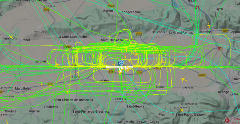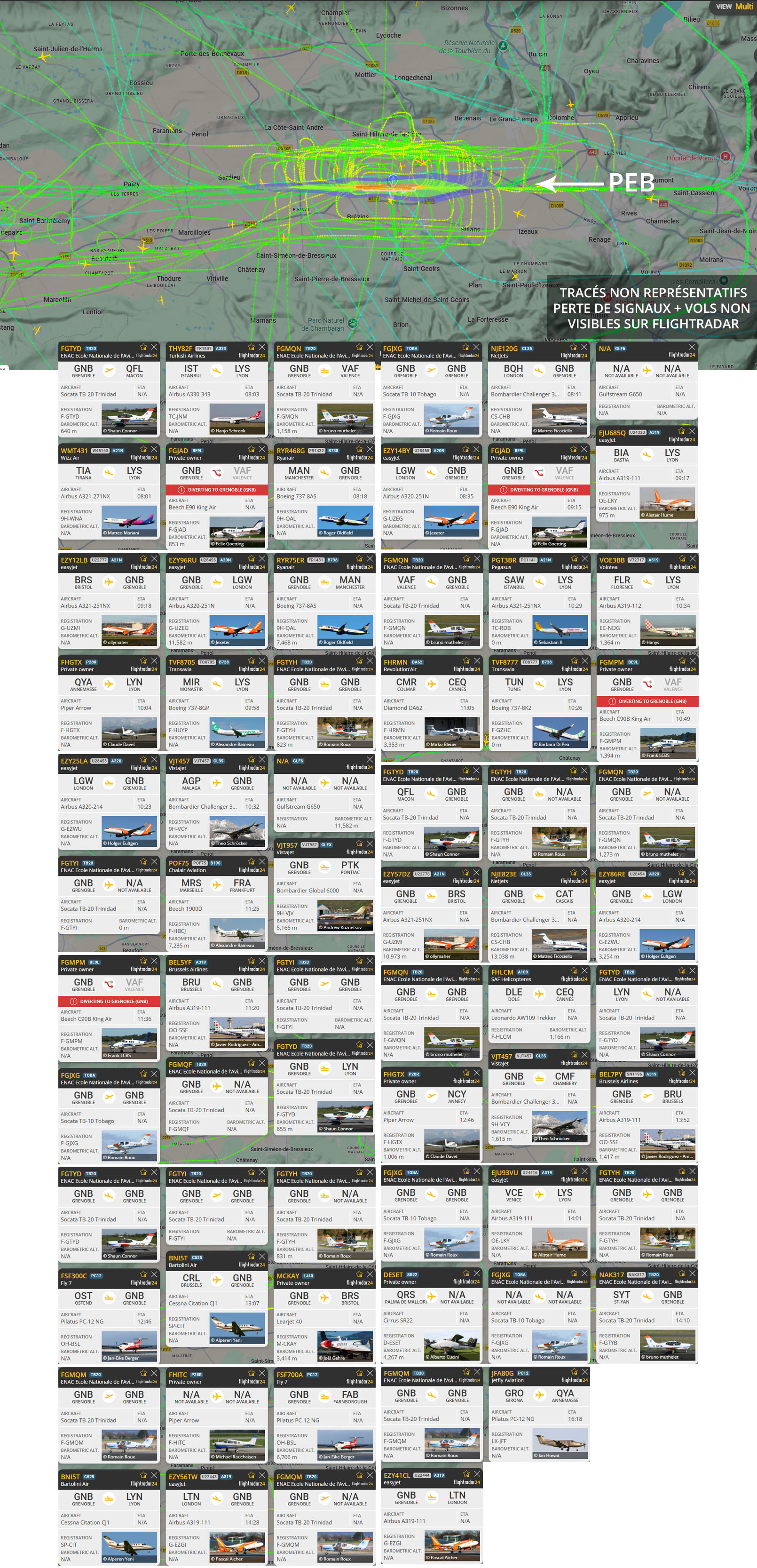 Visuel non représentatif de la réalité, perte fréquente de signaux et vols non visibles sur Flightradar. * PEB : Plan d’exposition au bruit, absolument non représentatif de la réalité.