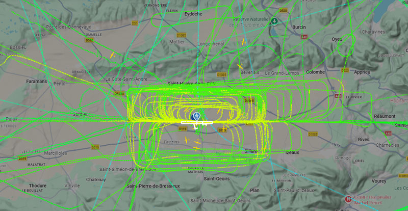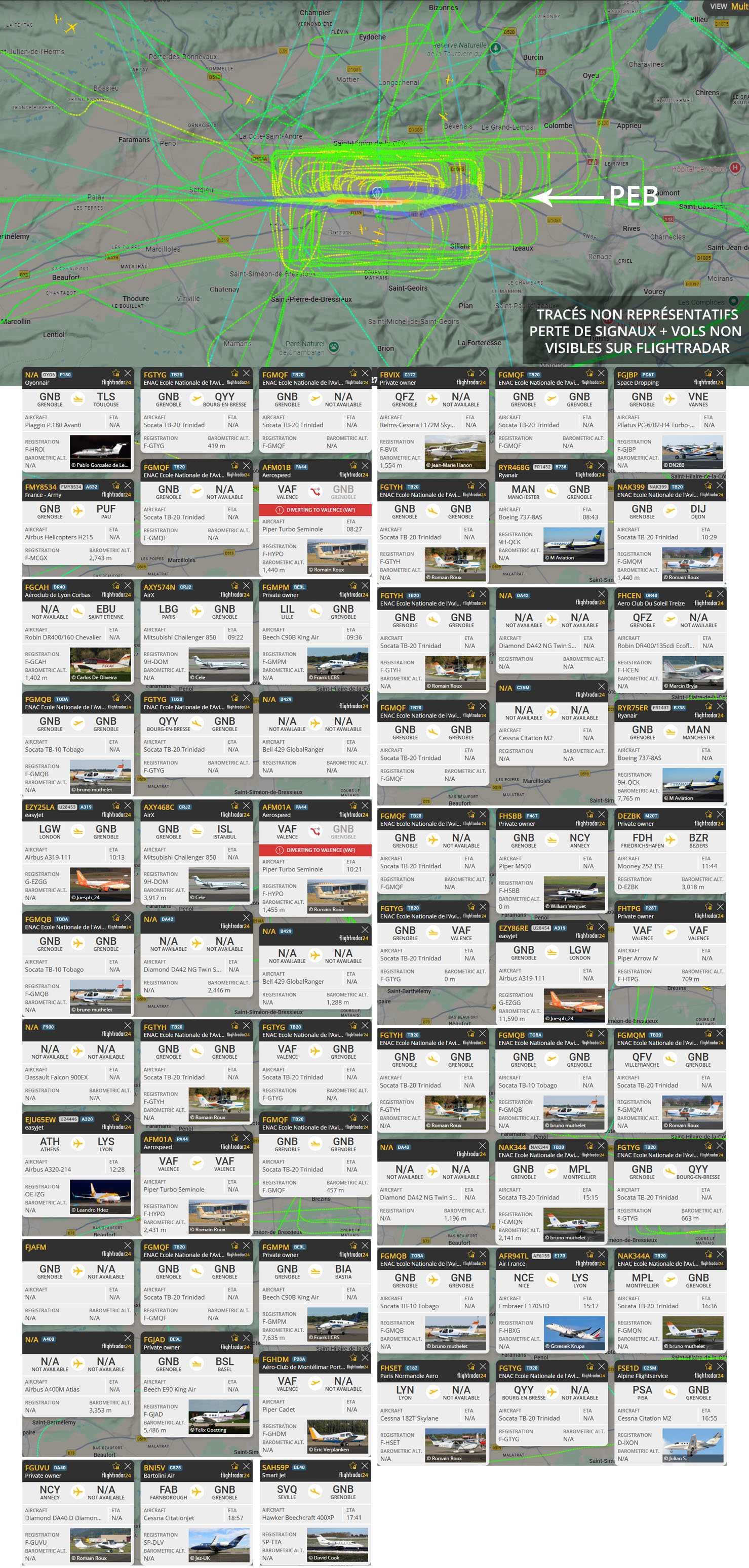 Visuel non représentatif de la réalité, perte fréquente de signaux et vols non visibles sur Flightradar. * PEB : Plan d’exposition au bruit, absolument non représentatif de la réalité.