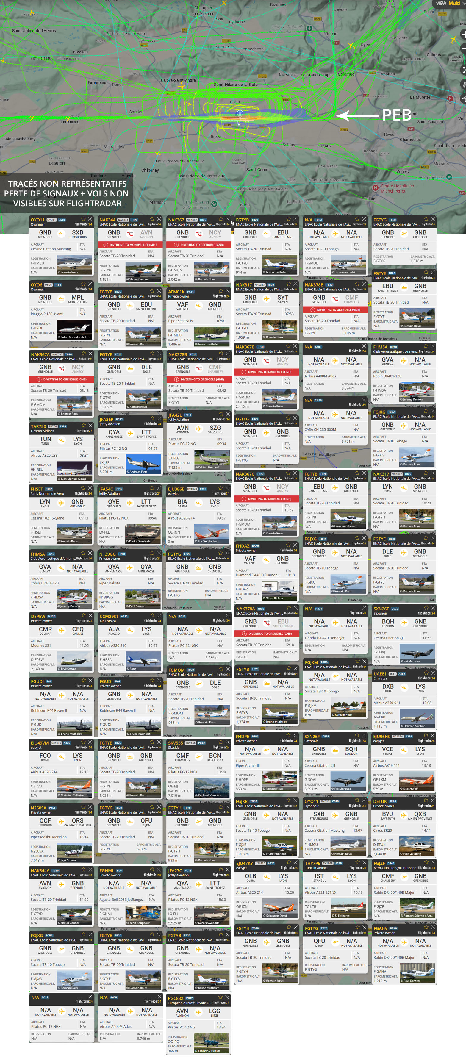 Visuel non représentatif de la réalité, perte fréquente de signaux et vols non visibles sur Flightradar. * PEB : Plan d’exposition au bruit, absolument non représentatif de la réalité.